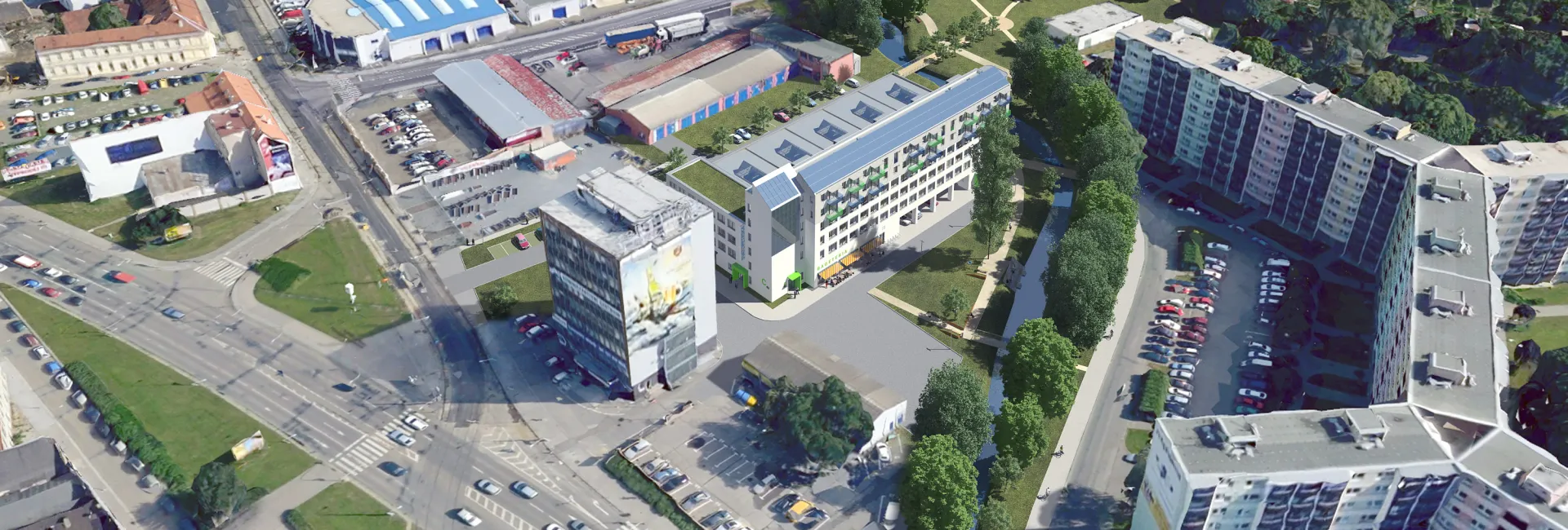 Blok A tvoří dva uliční objekty A01 – výšková administrativní budova a A07 – komerční prostor.